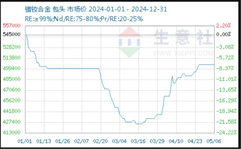 稀土價格對永磁材料價格的影響主要體現(xiàn)在成本上。稀土永磁材料主要由稀土元素和過渡金屬組成,其中稀土元素的供應(yīng)情況和價格變動會直接影響到稀土永磁材料的成本。稀土價格的上漲會導(dǎo)致永磁材料生產(chǎn)成本的增加,進(jìn)而推高永磁材料的價格。反之,稀土價格的下跌則會降低永磁材料的生產(chǎn)成本,有利于永磁材料價格的穩(wěn)定或下調(diào)。